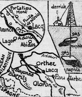 Le premier puits, situé à 200 mètres de la gare de Lacq, a atteint la nappe pétrolifère à 650 mètres de profondeur, le 21 décembre. Ce puits donnait 20 000 litres de naphte par jour, ce qui est peu, paraît-il. Le pétrole brut obtenu contenait 10 à 12 % d’essence, 15 % de gaz-oil et beaucoup d’asphalte à utiliser pour les revêtements routiers.